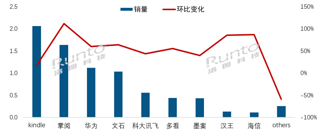 家電消費網7月6日訊 隨著今年6月Kindle宣布將退出中國市場,中國品牌開始快速瓜分搶奪Kindle的市場份額。昨天,大數據公司洛圖科技發布的監測數據顯示,今年5月,國產電子紙平板品牌均實現了電商銷量的高增長:掌閱環比增長111.7%,漢王、海信環比增長80%以上,華為、文石環比增長約60%,科大訊飛、多看、墨案環比增長40%。形成鮮明對比的是,Kindle雖然暫為品牌銷量榜首,但環比增速已經落到了TOP品牌中的最小增幅,只有15%左右。