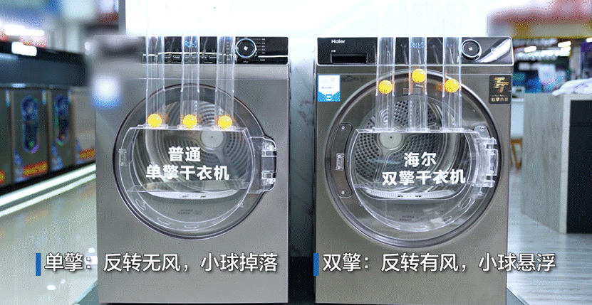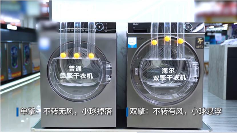 為了讓消費(fèi)者直觀了解到雙擎熱泵干衣機(jī)的技術(shù)原理與烘干效果,海爾干衣機(jī)近日發(fā)布了一則在賣(mài)場(chǎng)中做的乒乓球懸浮演示實(shí)驗(yàn)。工作人員將三個(gè)乒乓球放置在海爾雙擎干衣機(jī)的出風(fēng)口裝置上。啟動(dòng)后,乒乓球順風(fēng)而上,穩(wěn)穩(wěn)的懸浮到空中。另外一邊的傳統(tǒng)單擎干衣機(jī)卻做不到讓3個(gè)小球懸浮,只能吹上去就掉落下來(lái)。