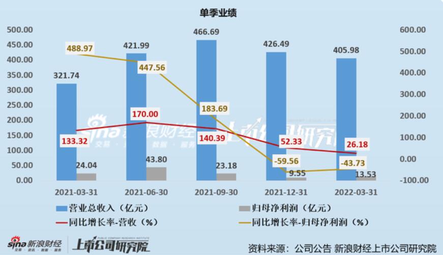 日前,TCL科技發布的今年一季度財報顯示,營收為 405.98 億元,同比增速只有 26.21%,相比上年同期下滑了 80.43%,凈利潤則是同比下滑 43.73% 至 13.53 億元,扣非凈利潤則大降 71.19%。