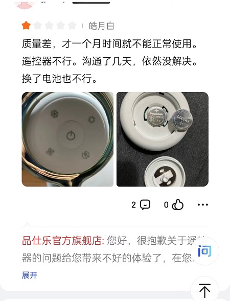今天,家電消費網登錄京東平臺,看到有購買品仕樂的消費者評價稱,該產品“質量差,才用一個月時間就不能正常使用。遙控器不成。溝通了幾天,依然沒解決。換了電池也不行。”“用了不到一個月,桿子抽出來就自動往下滑,沒有阻尼了。”還有消費者認為該產品噪音過大。