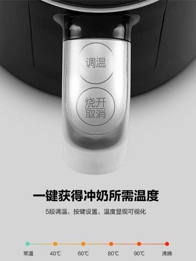 壺身有液晶大屏實時顯示水溫?粗谏珘厣砩巷@示水溫的熒光綠色數字不斷變化,頓感高科技帶來的生活品質的提升。 5段調溫,按鍵設置,溫度實現可視化。40度的溫度沖泡奶粉,60分蜂蜜水,80度泡綠茶,90度泡咖啡……超大的字體,也方便家中老人看清、使用。