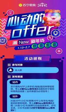 主張“換新”,蘇寧易購除了有首發的產品、用心的服務,更有全新的玩法。年貨節,手機、電腦、數碼品類摒棄參數論,注重產品功能與消費體驗的分享,無論是面向所有3C產品的“超New新年貨”種草大賽,還是與vivo聯合舉辦的“虎虎生V”創意評選,都立足產品體驗,邀請用戶到蘇寧易購門店體驗新品,并通過圖文、視頻等方式,參與產品分享與種草,最終根據發布內容的質量評分,發放各類獎勵。