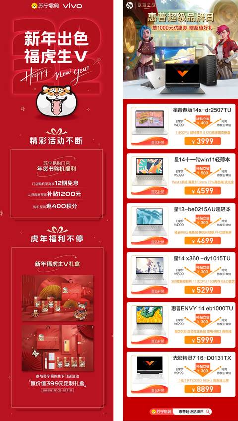 產品層面,蘇寧易購聯合3C品牌,主打新品、發力爆款。華為P50折疊屏、小米12、一加 10 Pro、榮耀Magic V、iQOO 9等先后首發,新品至高24期免息。同時,vivo超級品牌日、惠普超級品牌日也定檔1月14日,屆時千元神券、爆款至高直降400元、虎年定制禮盒等將登陸蘇寧易購惠及用戶。不僅如此,iPhone 13等爆款尖貨搶300元券,電腦指定品牌至高用券600元,多款數碼產品享1件9折、2件8折活動。