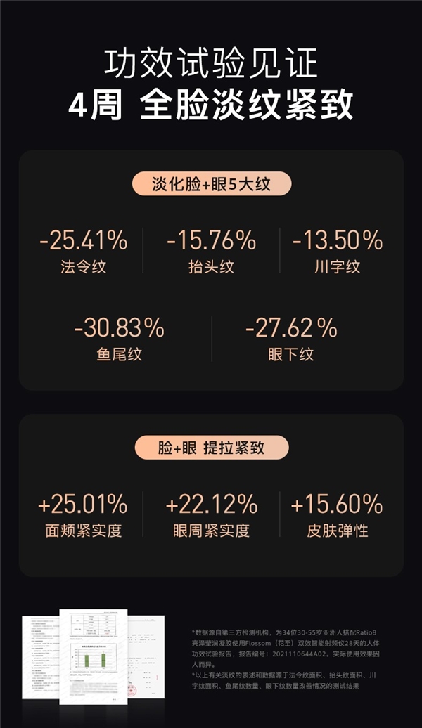 據(jù)介紹,在產(chǎn)品功效性認(rèn)證上,花至抗老射頻儀已經(jīng)在國內(nèi)權(quán)威三甲醫(yī)院中山大學(xué)附屬第三醫(yī)院聯(lián)合第三方檢測機(jī)構(gòu)對34位中國受試者完成4周人體功效試驗(yàn),結(jié)果顯示各方面指標(biāo)都得到較大的提升,更長時(shí)間的3個(gè)月功效試驗(yàn)正在進(jìn)行中。