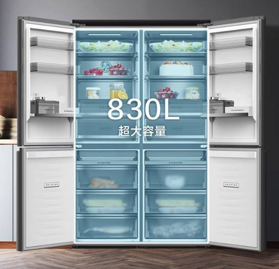 對于三世同堂、四世同堂的大家庭來說,海信真空·超薄冰箱415還提供了更具想象力的使用方式,消費者可以將兩臺冰箱組合成一臺雙開門冰箱,瞬間就能擁有830L超大空間。不僅如此,冰箱兩側的箱門都支持90°展開,實際使用時完全不會產生違和感。