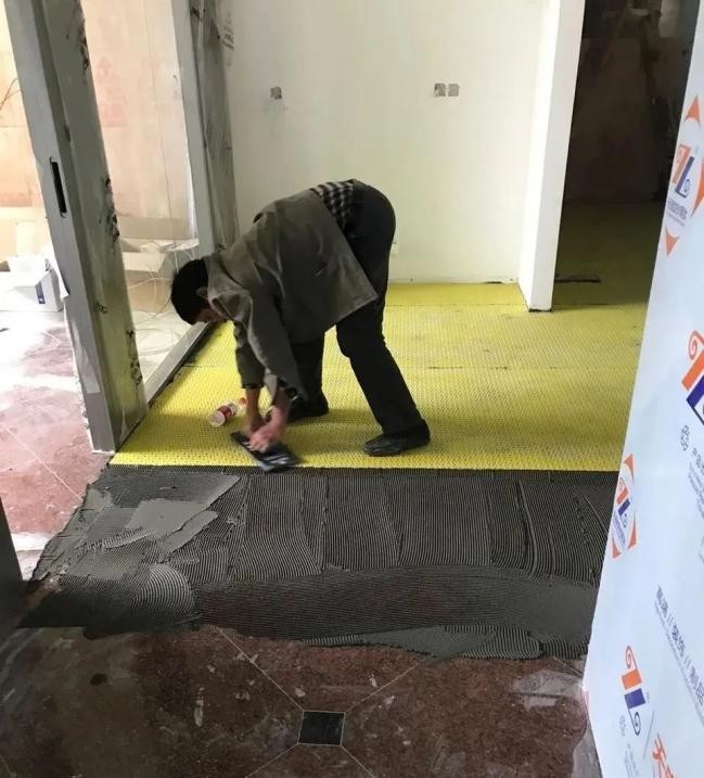 這是一款操作簡(jiǎn)便的抗裂墊。由于鋪貼墊特別為薄貼瓷磚和天然石材進(jìn)行設(shè)計(jì),且其主要在石材底層進(jìn)行鋪裝,因此鋪貼前必須確保基層的高平整度。在此基礎(chǔ)上,不需要專門進(jìn)行復(fù)雜的防水處理,只需在密封接縫和地板或墻壁連接處用專用防水卷材做防水處理即可,方便快捷高效。之后,只需進(jìn)行基面布膠、鋪貼墊下地、檢查滿粘率、鋪貼墊表面批刮膠條、鋪薄板等幾個(gè)簡(jiǎn)單操作即可成形。