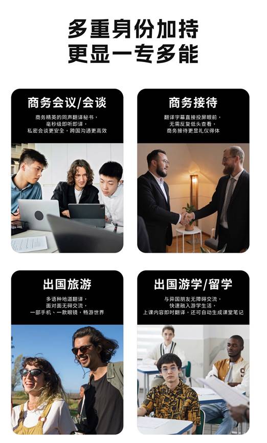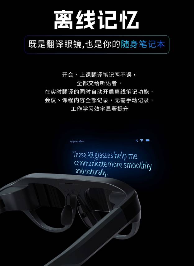 得益于新的引擎,眼鏡還支持源語言自動識別,只需一次設定好目標語言,即可直接翻譯各國語言,無需反復設置,溝通更及時更便利。它還能自動過濾目標語言,不會對目標語言的聲音進行翻譯,讓屏幕中內容的呈現更加干凈,易于閱讀。
