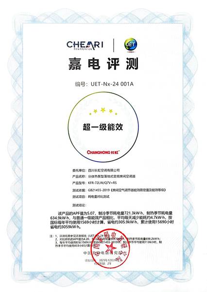 普通一級能效柜機的能效比為4.2,長虹巨能省柜機能效比高達5.0,比普通1級能效每天可節省4.7度電,按照國標每年平均使用1569小時計算,可節省305.9度電,10年可節省3059度。憑借優秀的能效表現,巨能省榮獲了中國家用電器研究院頒發的首張空調行業舒適風空調超一級能效證書。