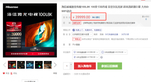 價格方面,激光電視往往對標的是電視機,一般價格偏貴,海信100L8K激光電視打出的口號是“全球首款 8K 激光電視”,售價高達39999元,即使是80英寸款,售價也突破萬元,高達15999元。