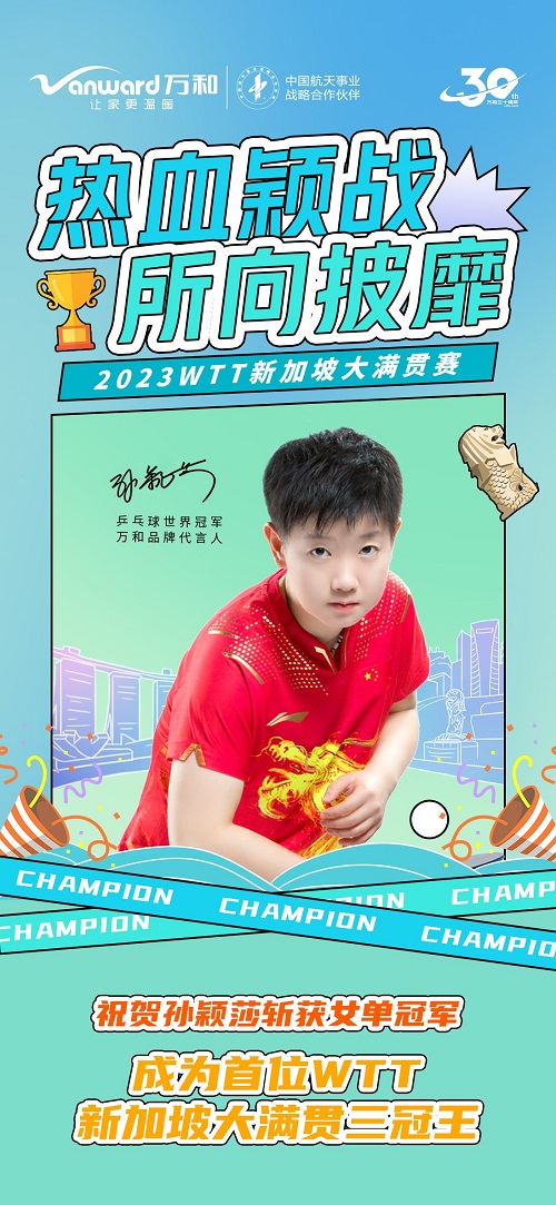 熱血依舊,2023WTT新加坡大滿貫,萬和代言人孫穎莎榮獲三項冠軍!