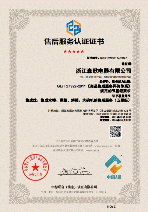 消費升級的時代,好產品必不可少,同樣好服務更是不可或缺,在當代社會中,優質的服務已經成為品牌俘獲人心的重要突破口。森歌的企業使命為“讓廚房生活更有品質”,即包括讓產品更有品質、讓服務更有品質等內涵。森歌始終將消費者的使用體驗放在首位,制定標準化服務流程,為“用戶價值新創造”,塑造高端服務形象,贏得了廣大消費者的高度認可和支持。森歌榮獲了五星級售后服務認證,受到行業和消費者的一致好評,同時,森歌也榮獲“全國售后服務行業十佳單位”和“全國顧客滿意行業十大品牌”,森歌強勁的品牌號召力和影響力由此可見一斑。