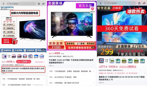 不僅如此,在某短視頻平臺(tái)也有不少產(chǎn)品與鏈接不匹配現(xiàn)象,通過(guò)極低的價(jià)格加上知名品牌吸引用戶(hù)關(guān)注,但點(diǎn)進(jìn)去之后出現(xiàn)的卻是另一個(gè)產(chǎn)品的詳情頁(yè)。例如標(biāo)題寫(xiě)的是海信電視機(jī)50/55寸,但詳情頁(yè)寫(xiě)的卻是創(chuàng)維大內(nèi)存智能語(yǔ)音電視。此外,也有不少店鋪打著正品行貨的旗號(hào),其實(shí)售賣(mài)的卻是山寨產(chǎn)品,例如鑫康佳、王牌菱等,相比一兩千的正品價(jià)格,這些山寨產(chǎn)品價(jià)格都極低,基本到手價(jià)都在500元以下。