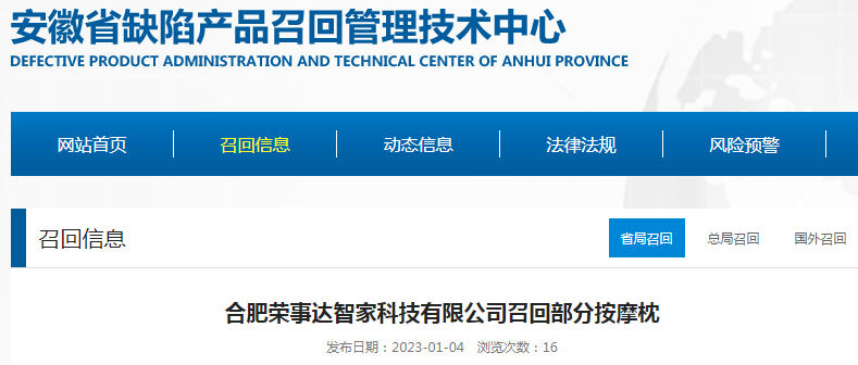 家電消費網1月10日訊 昨天,安徽省缺陷產品召回管理技術中心網站發布消息稱,合肥榮事達智家科技有限公司向安徽省市場監督管理局、合肥市市場監督管理局報告了召回計劃,自即日起,召回2021年8月2日生產的榮事達牌RSD-MAZ2S6型號按摩枕,涉及數量為50臺。