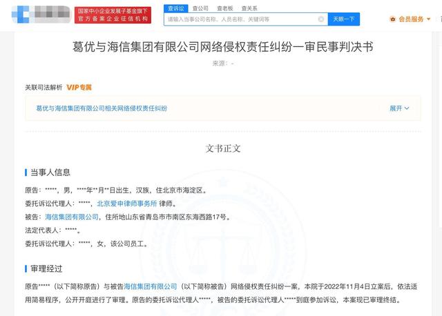 家電消費網3月2日訊 今天,葛優與海信集團有限公司網絡侵權責任糾紛一審判決書公開。