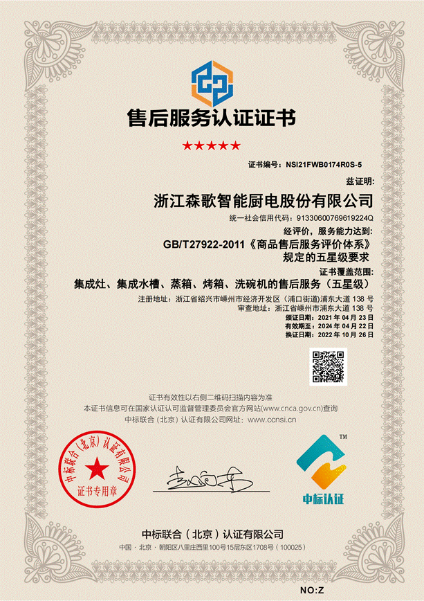 森歌在服務方面的投入不僅樹立起高標準服務,成為智能廚電行業新標桿,也讓森歌斬獲榮譽無數。在過去5年中,森歌連續5次收獲五星級售后服務認證,斬獲全國售后服務行業十佳單位、全國顧客滿意行業十大品牌等諸多口碑認證,成為行業優質服務模板。