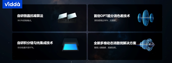 Vidda C1S搭載海信行業(yè)領(lǐng)先的LPU三色激光引擎,包含四大“黑科技”。其中的微晶抗噪算法深度優(yōu)化了DLP微鏡翻轉(zhuǎn)時(shí)序,可有效抑制噪點(diǎn)達(dá)99.9%;而OPT超分消色差技術(shù)的消色差效果可達(dá)98%,實(shí)現(xiàn)了畫(huà)面無(wú)重影;積分鏈勻光集成技術(shù)可將畫(huà)面亮度均勻性提升至97%。而在消散斑技術(shù)方面,海信擁有全球最多的102件專(zhuān)利,因此Vidda C1S搭載的全新多維動(dòng)態(tài)消散斑解決方案在行業(yè)內(nèi)率先實(shí)現(xiàn)了散斑的“人眼弱感”。