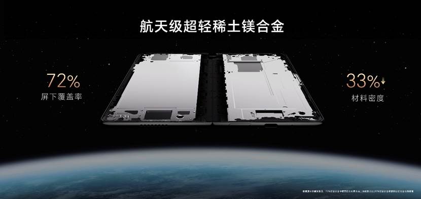 榮耀在折疊屏輕薄方面持續進行技術深耕,榮耀Magic Vs2機身重量最輕僅為229克,再次刷新大屏內折手機的輕薄紀錄。屏幕支撐架構采用航天級稀土鎂合金材料,材料密度降低33%,屏下覆蓋率達到72%。