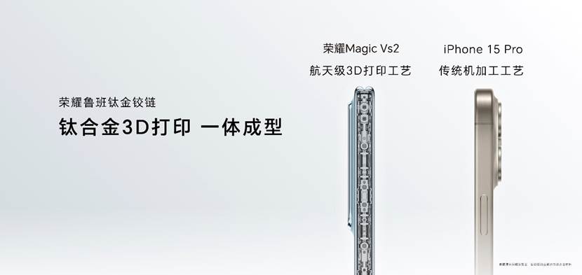 在折疊屏產品關鍵器件鉸鏈方面,榮耀Magic Vs2采用由鈦合金3D打印技術制成的榮耀魯班鈦金鉸鏈,帶來輕薄與堅固兼具的使用體驗。鉸鏈0齒輪結構和懸浮水滴結構的應用也讓榮耀Magic Vs2開合順滑,且支持多角度自由懸停。在輕量化更進一步的同時,榮耀Magic Vs2也做到了5.1mm的展開態厚度、10.7mm的折疊態厚度,在同類折疊屏手機當中繼續保持領先水平。