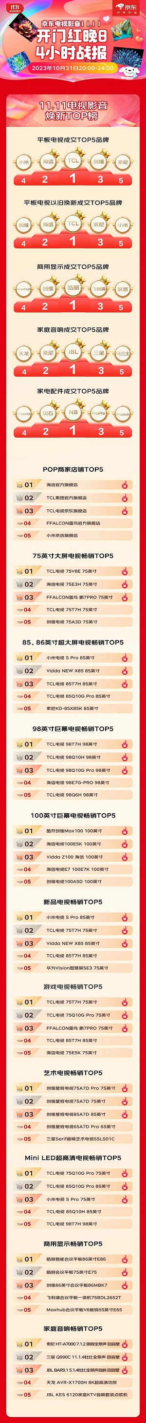 京東10月31日20點至24點彩電競速榜顯示,平板電視成交品牌,TCL位居第一。其中,98英寸巨屏電視暢銷榜前五中,TCL系電視占據了四位。分別是第一的TCL電視98T7H,第二的TCL電視98Q10H,第三的TCL電視98Q10G Pro,第五的TCL電視98Q6H。游戲電視暢銷榜前五中,TCL系電視占據了四位。分別是第一的TCL電視75T7H 75英寸,第二的TCL電視75Q10G Pro 75英寸,第三的FFALCON雷鳥 鵬7Pro 5英寸,第四的TCL電視85T7H 85英寸。