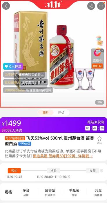 現在,登錄蘇寧易購APP搜索“飛天茅臺”參與預約,晚8點1499元準時開搶。