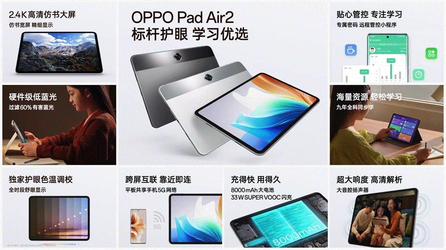 OPPO Pad Air2 支持遠程家長管控,精選優質學習內容,打造一站式智能教育中心,還可與手機無縫連接,實現通信共享、遠程管理文件、應用接力等互聯功能,讓學習更高效,是值得家長信賴的千元級護眼學習平板。新品配備 8000mAh 電池,支持 33W SUPERVOOC 閃充,并搭載 4個超大振幅單元,支持杜比全景聲,經杜比專業調音,帶來更佳視聽享受。