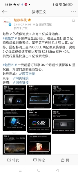 魅族稱,魅族21影像體驗全面升級。基于第三代驍龍8強大算力的加持,搭配特調三星ISOCELL兩億像素傳感器,實現了2億像素成像速度比三星S23 Ultra提升40%,挑戰行業最快直出2億像素成像。