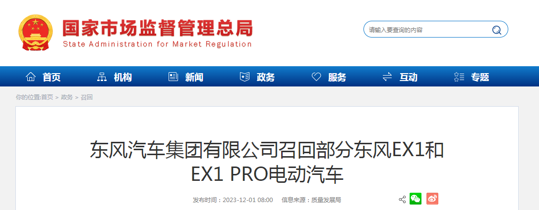 家電消費網(wǎng)12月1日訊 昨天,東風汽車集團有限公司根據(jù)《缺陷汽車產(chǎn)品召回管理條例》和《缺陷汽車產(chǎn)品召回管理條例實施辦法》的要求,向國家市場監(jiān)督管理總局備案了召回計劃。即日起,召回2021年3月27日至2022年12月19日生產(chǎn)的部分東風EX1和東風EX1 PRO電動汽車,共計33618輛。