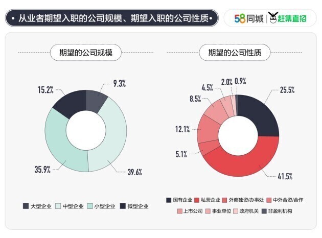 在后疫情時代,職場人的理想生活主要以家人健康,快樂簡單為主,著眼于此,面對期望的公司規(guī)模,多數(shù)職場人選擇了工作壓力相對較小的中型企業(yè)與小型企業(yè),其中44.6%的90后出于職業(yè)發(fā)展角度考慮,首選中型企業(yè)。從企業(yè)性質(zhì)來看,有41.5%的職場人期望入職薪資、福利待遇更有競爭力的私營企業(yè),25.5%的職場人傾向于相對穩(wěn)定的國有企業(yè)。