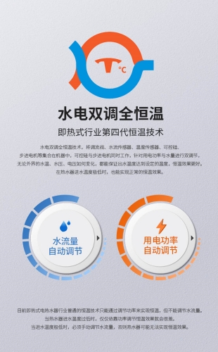 水電雙調(diào)全恒溫技術(shù),可以同時(shí)自動(dòng)調(diào)節(jié)用電功率與水流量,無論外界的水溫、水壓、電壓如何變化,都能保證出水溫度達(dá)到設(shè)定的溫度,恒溫效果更好,水量與水溫也更精準(zhǔn)。