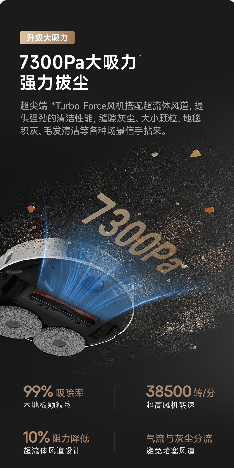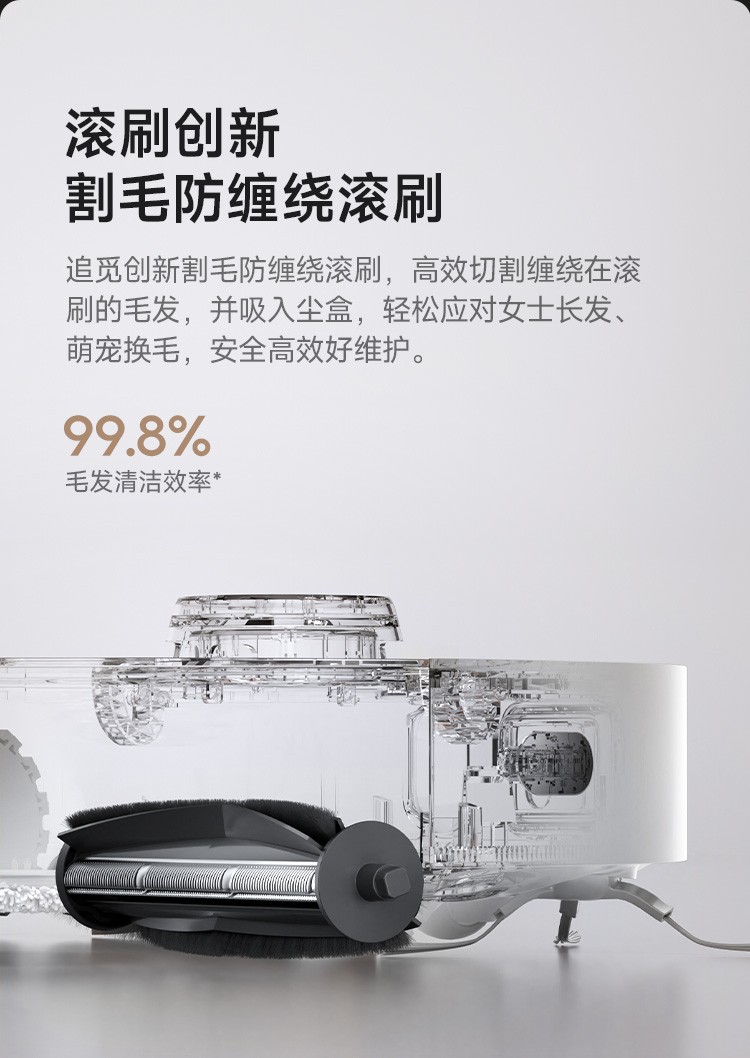 7300Pa強(qiáng)大吸力持久穩(wěn)定,行業(yè)首創(chuàng)主動(dòng)式割毛防纏繞滾刷,毛發(fā)清潔無憂