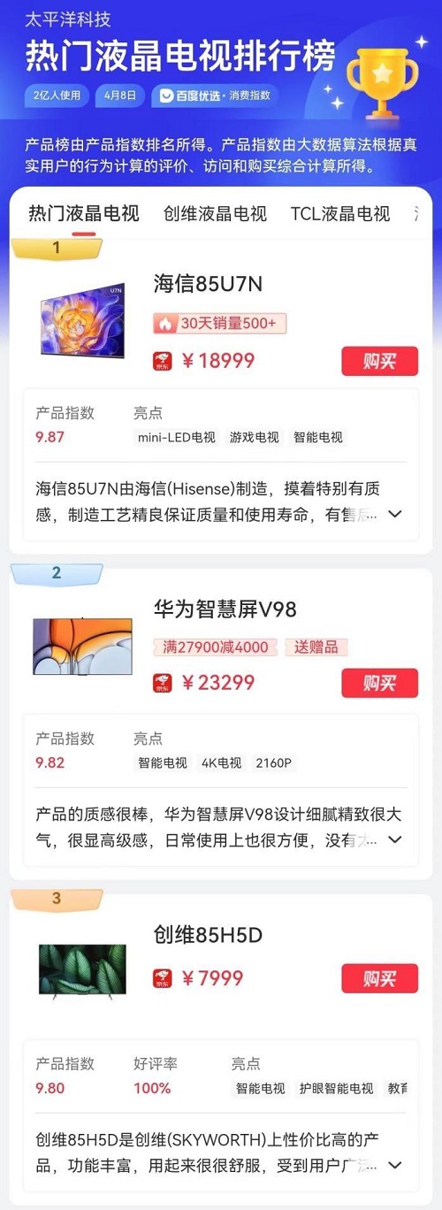 就在近日,太平洋科技發布了熱門液晶電視排行榜。作為超2億人參考的權威榜單,榜單排名是基于大數據算法,通過用戶評價、訪問和購買綜合計算所得,具有極高參考價值。其中,85吋版本的海信電視U7N憑借出色的畫質表現,登上榜單TOP1,再次驗證了其市場“爆款王”的實力。