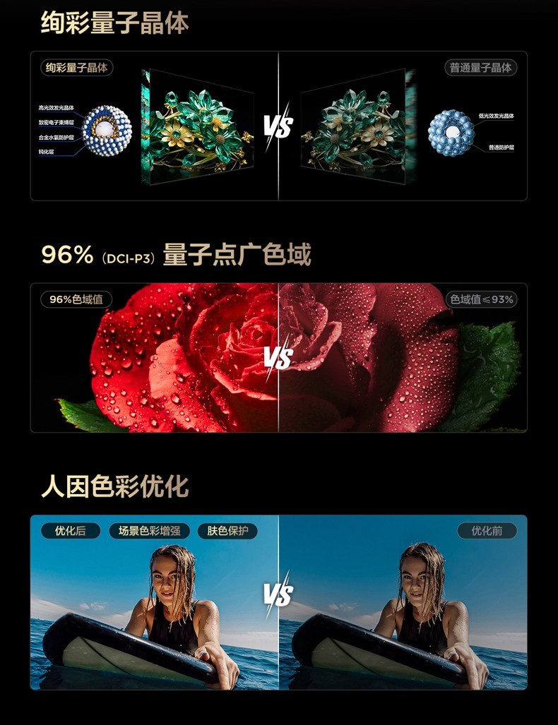 除此之外,TCL還全新升級了量子點(diǎn)技術(shù),量子點(diǎn)作為當(dāng)下最好的發(fā)光材料,可以大幅提高電視畫面的色域值,并使得畫面顏色更接近現(xiàn)實(shí)實(shí)物,而TCL已經(jīng)積累了高達(dá)2485件量子點(diǎn)相關(guān)專利,并且擁有近百人專家團(tuán)隊及國際電致發(fā)光量子點(diǎn)實(shí)驗(yàn)室,可謂是量子點(diǎn)技術(shù)的先鋒。TCL這次推出的量子點(diǎn)Pro 2025不僅實(shí)現(xiàn)了更廣的色域覆蓋范圍,還延長了使用壽命,讓用戶能夠更長時間地享受高質(zhì)量的畫面效果。更重要的是,它還能夠識別圖像的內(nèi)容,并根據(jù)人眼對不同畫面的敏感度進(jìn)行精細(xì)化的畫質(zhì)調(diào)校。這樣一來,畫面呈現(xiàn)出來的色彩不僅更加好看,還更加符合人眼的喜好,讓觀看體驗(yàn)更加舒適。