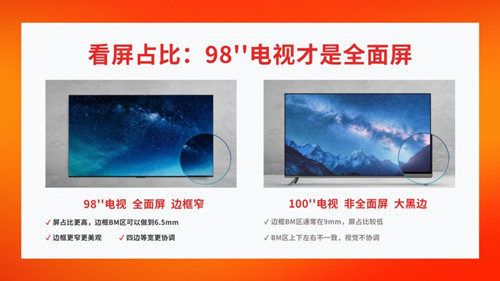 全面屏,是現代電視設計的潮流趨勢。但并不是說屏幕大就一定是全面屏。98吋的屏占比高、邊框窄,邊框BM區更是可以做到6.5mm,將全面屏的美學展現得淋漓盡致。相比之下,100吋電視的邊框通常在9mm左右,大黑邊顯得有些突兀。更值得一提的是,98吋電視的上下左右BM區都是等寬的,全面屏的設計既美觀又協調。而100吋電視則因為不等寬的邊框設計,視覺上不免有些不協調。
