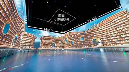 通過四面可伸縮的紗幕投影,創(chuàng)造出富有層次感和立體感的視覺效果,極大地增強了感染力和氛圍感?紤]到空間橫跨面積較大,施工難度較高,現場采用了豎投安裝方式,確保投影畫質的清晰和細膩。