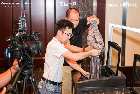 緊接著,向與會嘉賓展示了美菱超級屏滾筒洗衣機的雙機斜立技術。超級屏洗衣機憑借其DD直驅電機,實現了零位移和零抖動的卓越性能。即使在1400轉的高速運轉下,也能保持穩定如初,徹底解決了傳統洗衣機在高速旋轉時容易出現的移位和抖動問題,引得現場店主為之贊嘆不已。