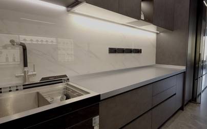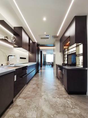 吊柜選用黑色極窄鋁框搭配茶色玻璃