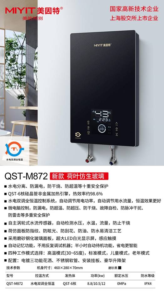 2024年5月,熱水器行業的時尚品牌美因特對外界宣布:全新水電雙調全恒溫平臺的新品M872正式上市,M872分為QST硅晶系列與DST鑄鋁系列,DST-M872的上市,意味著美因特鑄鋁發熱體即熱式產品也開始應用水電雙調全恒溫技術。
