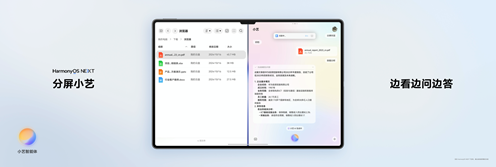 在HarmonyOS NEXT的加持下,小藝智能體也迎來全新升級。用戶只需要將文本、圖片、文檔長按選中,并拖拽到屏幕下方彈出的對話框中,即可召喚小藝,讓小藝進行表格提取、總結摘要、文檔翻譯等操作。“小藝分屏”模式下,用戶還可以在生成內容的同時,打開華為筆記或備忘錄進行記錄,并針對感興趣的問題進行提問,實現同步解答。不僅如此,全新小藝新增“識屏對話”功能,通過屏幕內容,小藝能理解用戶口中的“這里”、“這個”等代詞,帶來了更加絲滑的問答體驗。