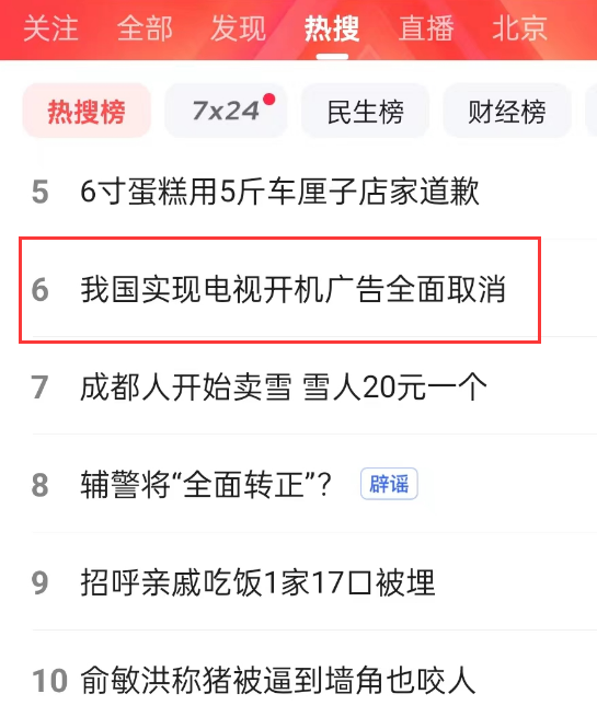 “我國實現電視開機廣告全面取消”沖上百度熱搜