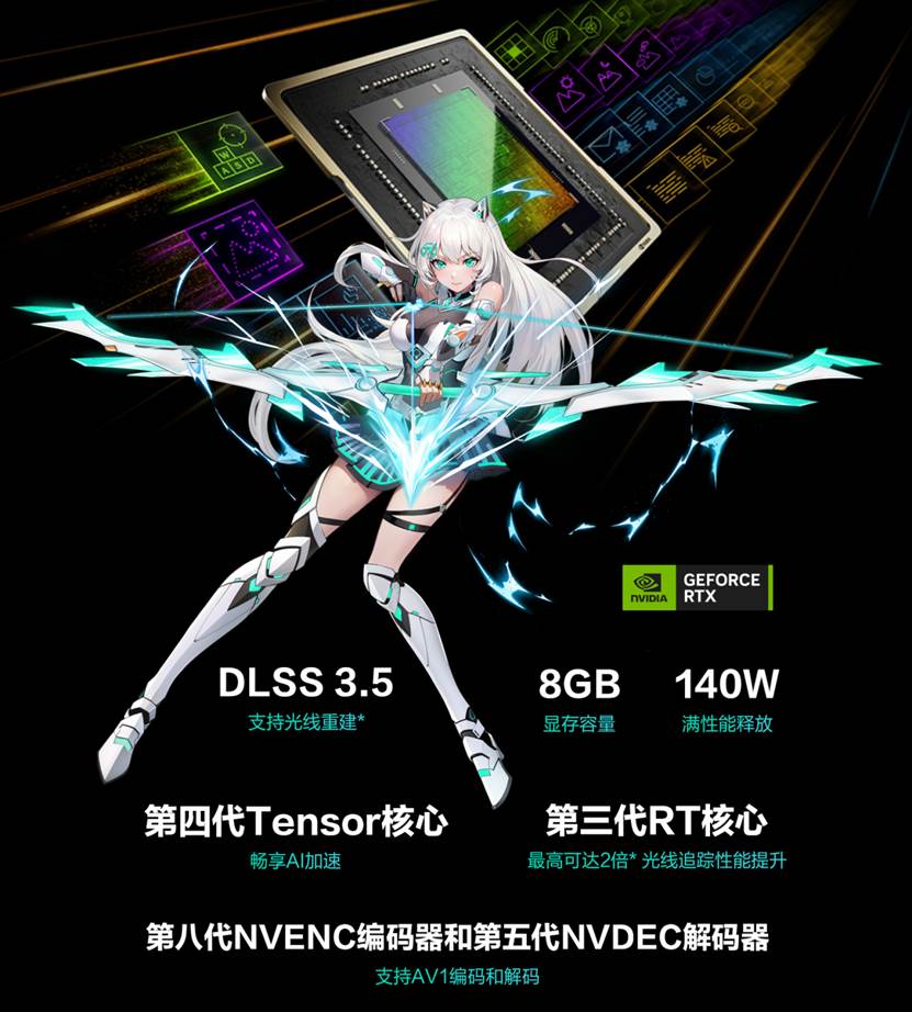 在顯卡方面,天選5 Pro銳龍版搭載了更適合電競愛好者們的RTX 4060/4070筆記本電腦GPU,配備8GB GDDR6大容量顯存,擁有140W滿性能。支持光追和DLSS 3.5技術,不僅能夠大幅度提高沉浸感和真實感,還可以在保證畫質的前提下讓游戲畫面更加流暢。此外,天選5 Pro全系還支持雙顯三模顯卡熱切換,更高性能與更長續航,隨意選擇。