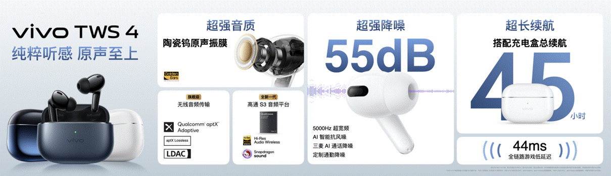 據了解,為了充分還原原聲,vivo TWS 4搭載行業首創的陶瓷鎢原聲振膜和超寬頻聲音單元,采用第二代高通S3音頻平臺,支持 LDAC無線音頻傳輸,為用戶帶來Hi-Fi級音質的原聲聽感。vivo TWS 4 Hi-Fi版更是全球首發第三代高通S3音頻平臺,支持aptX Lossless無線無損傳輸,為用戶提供全鏈路至臻Hi-Fi的聽感體驗。vivo TWS 4支持55dB深海降噪,降噪頻寬達5000Hz,支持AI雙通透模式與AI自適應模式,智能匹配降噪深度。不僅如此,vivo TWS 4還支持最高45小時續航、44ms游戲低延時、遙控拍照、實時翻譯等功能,用戶體驗得到大幅提升。