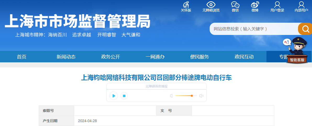 家電消費網4月29日訊 昨天,上海鈞哈網絡科技有限公司召回部分棒途牌電動自行車。