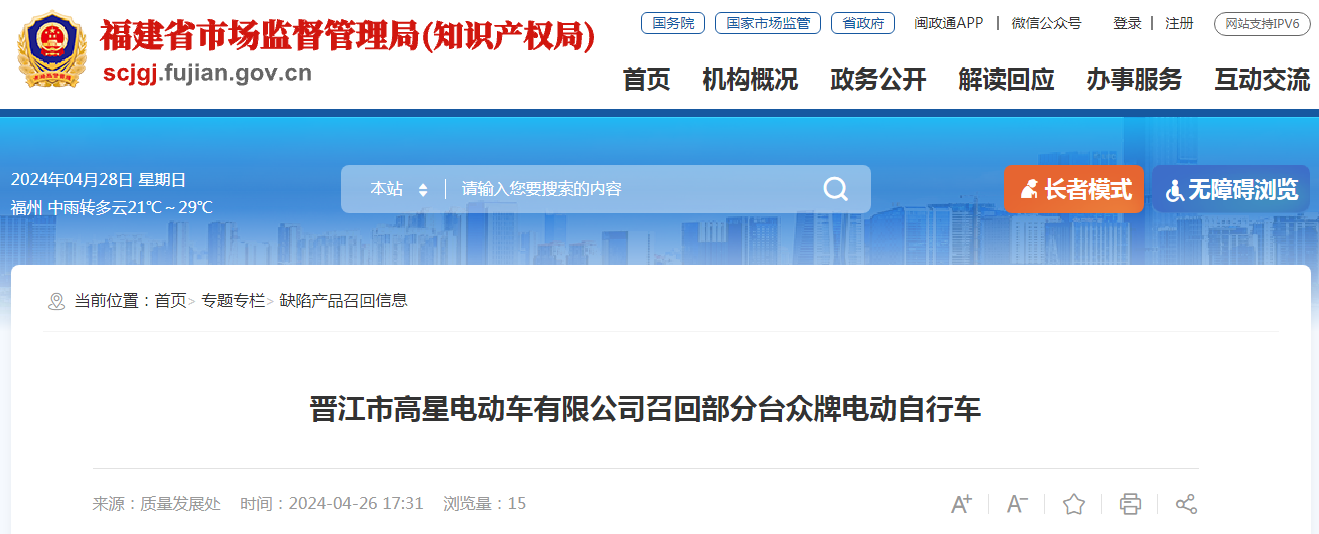 家電消費網4月29日訊 昨天,福建晉江市高星電動車有限公司向福建省市場監督管理局報告了召回計劃,將自即日起,召回2023年05月11日至2023年05月12日期間制造的型號規格為TDT002Z,生產批號為20230512的臺眾牌電動自行車,涉及數量為5輛。