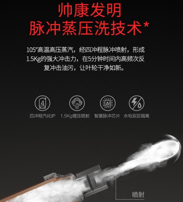 近幾年,不少品牌的油煙機都增加了自清潔功能,以期解決困擾消費者的油污清洗問題,但是消費者在使用中發現該功能清潔能力相當有限。有的自清潔鍵只是提醒消費者清洗油杯;有的自清潔功能則因為技術創新有限,導致蒸汽力度不夠,無法將煙機中的油垢清洗出來。帥康獨家研發出“脈沖蒸壓洗”技術,并獲得了專利(專利號:201920647914.5),成功打破了行業瓶頸。其核心主要是四沖程脈沖噴射:將集成灶水盒內的水抽入四沖程汽化爐后,迅速加熱,汽化成水蒸汽。在脈沖控制閥閉合狀態下,汽化室內的壓力隨著水蒸汽的不斷產生而變大,從而使得蒸汽溫度達到105℃。每間隔1秒時間,脈沖控制閥開啟,蒸汽形成強勁的粒子汽錘,以1.5kg的沖擊力噴射出去。搭載該技術的自動清洗集成灶,能夠產生105度高溫高壓蒸汽,1.5公斤強大沖擊力, 5分鐘高頻次反復沖擊油污,深度清洗不反味,持久保持葉輪干凈如新,洗凈率高達96%。