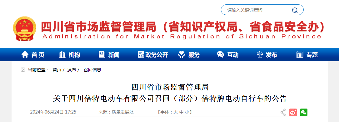 家電消費網6月28日訊 昨天,四川倍特電動車有限公司向四川省市場監督管理局報告了召回計劃,將自即日起,召回2022年8月20日生產的(部分)電動自行車,品牌:倍特,規格型號為:TDT044Z, 涉及數量共計8輛。