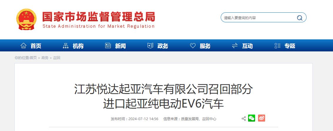 家電消費網7月14日訊 昨天,江蘇悅達起亞汽車有限公司向國家市場監督管理總局備案了召回計劃。決定自2024年7月15日起,召回2023年6月8日至2023年11月1日期間生產的部分進口起亞純電動EV6汽車,共計165輛。