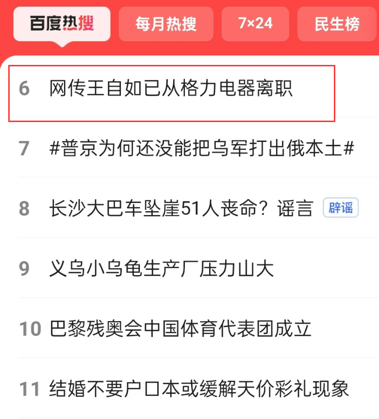 “網(wǎng)傳王自如已從格力電器離職”沖上熱搜