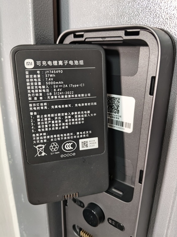 打開內門鎖的內蓋,可以看到2 Pro采用了雙電池設置。上面為5000mAh鋰電池,鋰電池可通過USB-C接口進行充電。下面則有一組四個5號電池。其供電邏輯為鋰電池優先供電,當鋰電池電量低于10%時切換到干電池供電的模式。小米官方稱這款門鎖鋰電池的供電時間為4個月,而4節干電池單獨供電續航時間也為4個月。筆者看到,無論是鋰電池還是普通電池,都會在高清顯示屏上顯示實時電量,讓人不用擔心續航問題?鞗]電時,小米2 PRO也會出現紅色燈進行提醒充電。