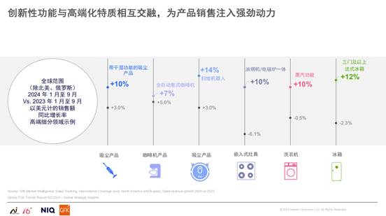 市場數據方面,高端家電市場份額也并未出現明顯下滑,尤其在以舊換新政策推動和技術創新加持下,高端家電依舊為家電銷售注入了強勁的動力。從《報告》來看,“國補”發力后,2024年9-10月,彩電、冰洗空、熱水器、油煙機、燃氣灶品類的一、二級能效占自身品類份額均快速提升。創新產品如超薄/零嵌/平嵌冰箱、超薄/全嵌/可升降油煙機、洗消/存嵌/大容量洗碗機、高端/品質/全自動咖啡機等,不斷滿足用戶因消費升級和生活品質提升而產生的多樣化需求。