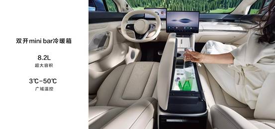 前排中央扶手箱可選配8.2L雙開mini bar冷暖箱,支持3-50度廣域溫控,讓乘客暢享冷熱飲料,還有中控儲物格、肩枕音響等配置,體驗更貼心。